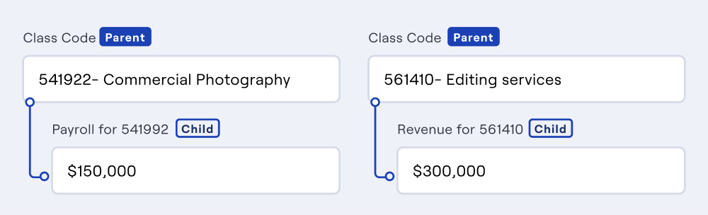 - Parameters can have parent/child relationships. Some parameters are children of parent parameters, and some child parameters can be parents to other parameters. For example, if an applicant performs work in multiple industries, they may need to submit revenue for each industry. In this case, the risk parameter for industry (class code) would be a parent of the risk parameter for revenue.